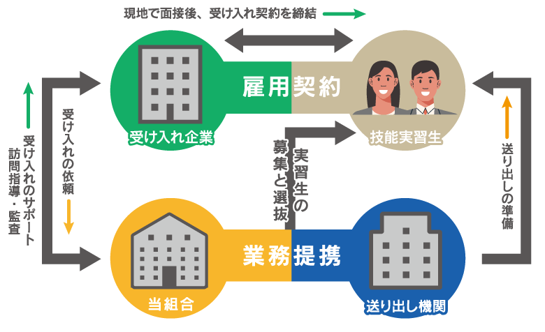外国人技能実習制度を利用するうえで、「監理団体(当組合)」と「送り出し機関(現地機関)」は、重要な役割をもっております。